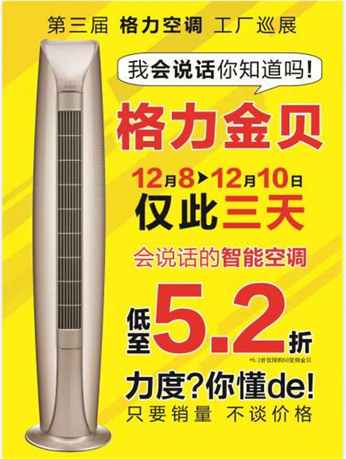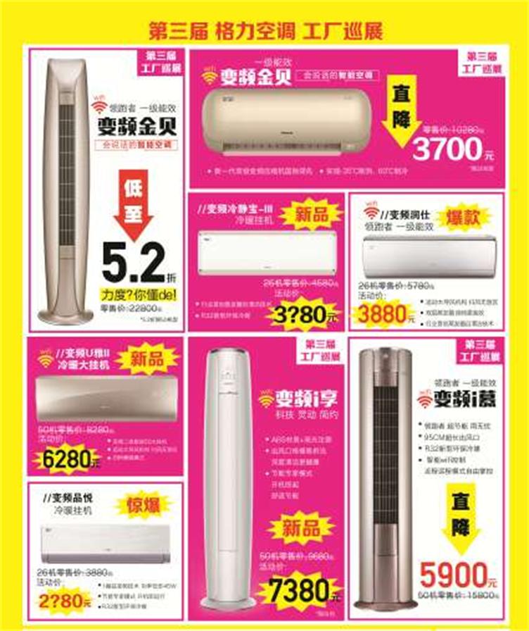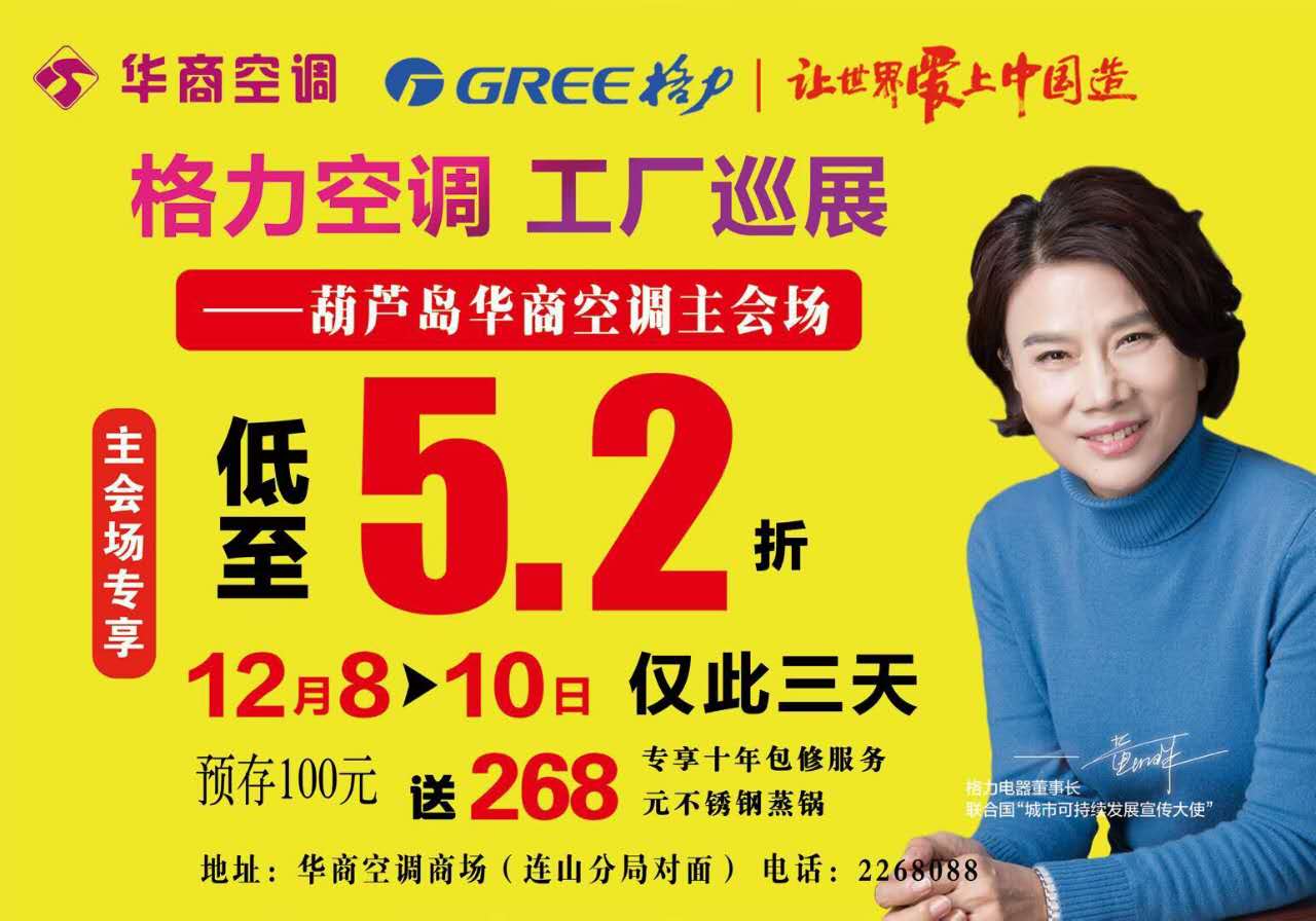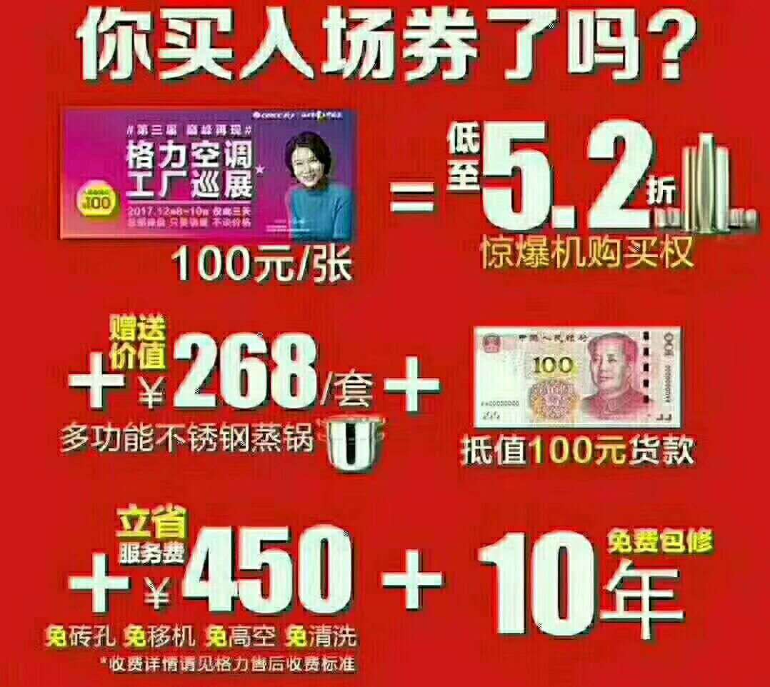華商空調(diào)又有大動作了。!格力空調(diào)2017年度工廠巡展,董總操盤只要銷量,不談價格。僅此一次,價格低到超乎你想象!即日起全面接受認籌,當天憑入場券可以免費領取268元白鋼蒸鍋一個!享受10年保修,四項免費!超低的價格,超快的安裝,超值的服務,還有一款“會說話”的空調(diào)等你們來參觀哦!想買空調(diào)的你們還在等什么?快來搶購入場券吧!!